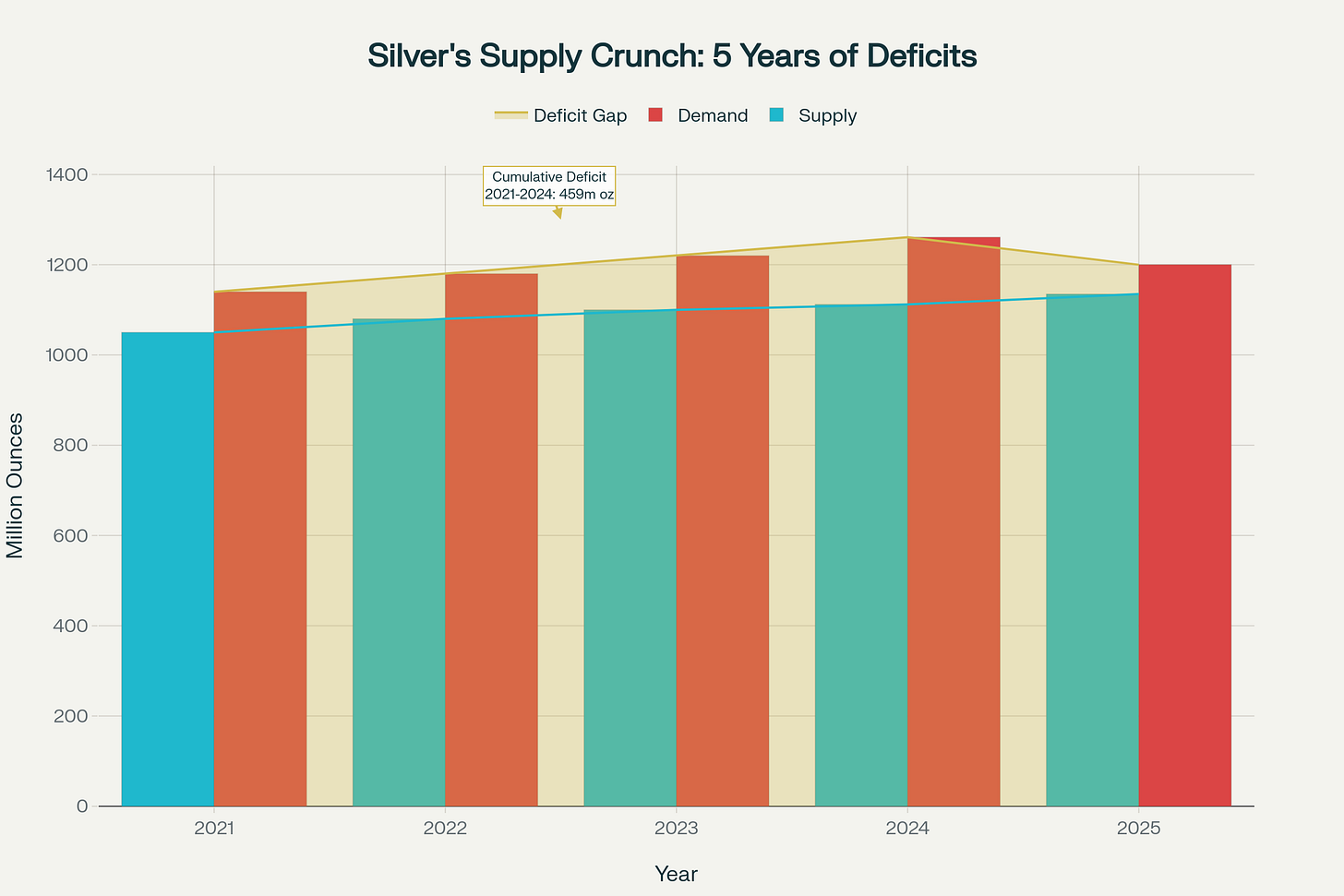 The result? Silver industrial demand hit a record 680.5 million ounces in 2024—the fourth consecutive record. And the market has been in a supply deficit for five straight years now.
