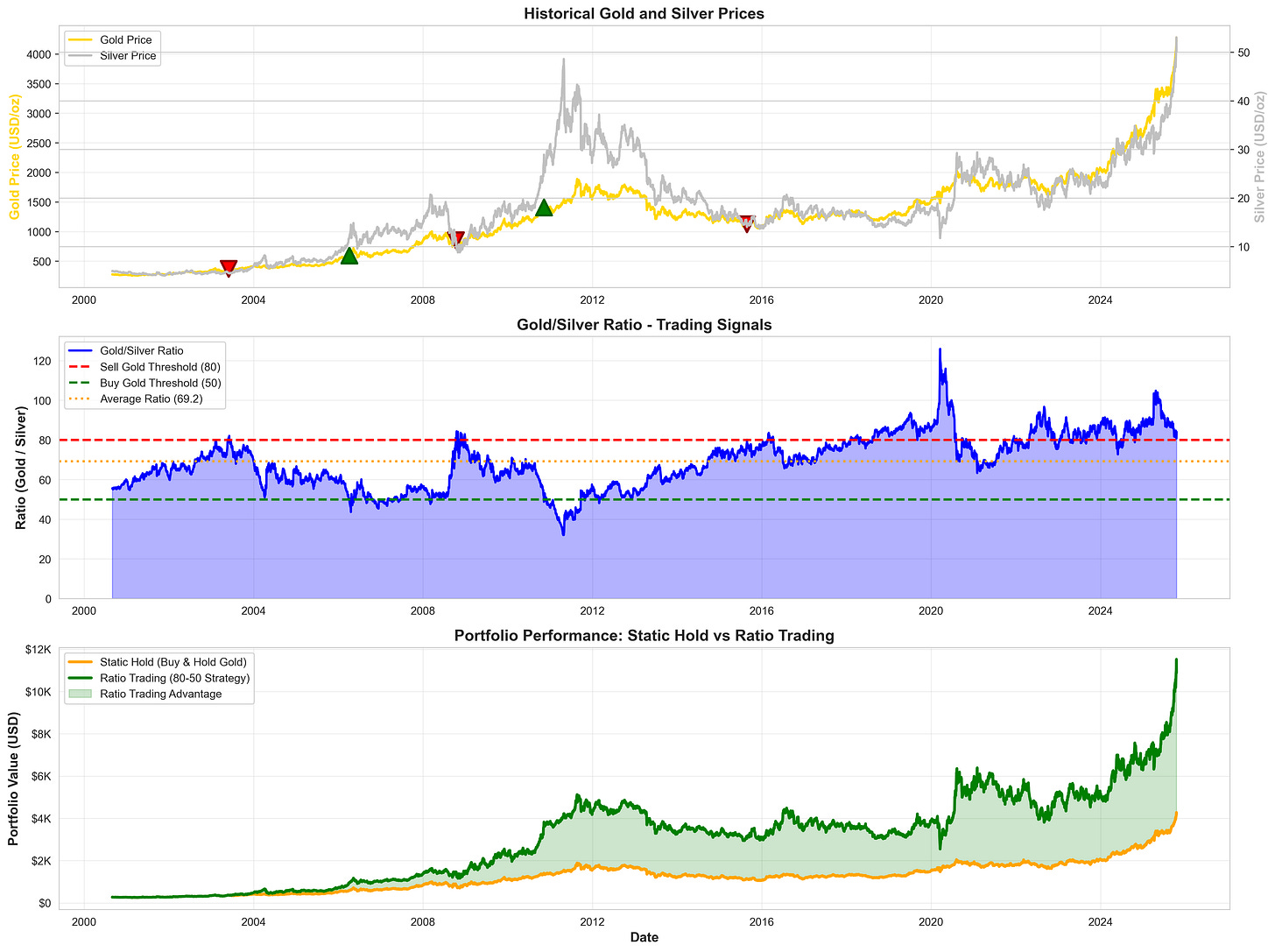 The ratio trading strategy delivered 2.58x better total returns than just holding gold—turning $10,000 into $397,600 instead of $153,800. That’s an extra $243,800 in your pocket.