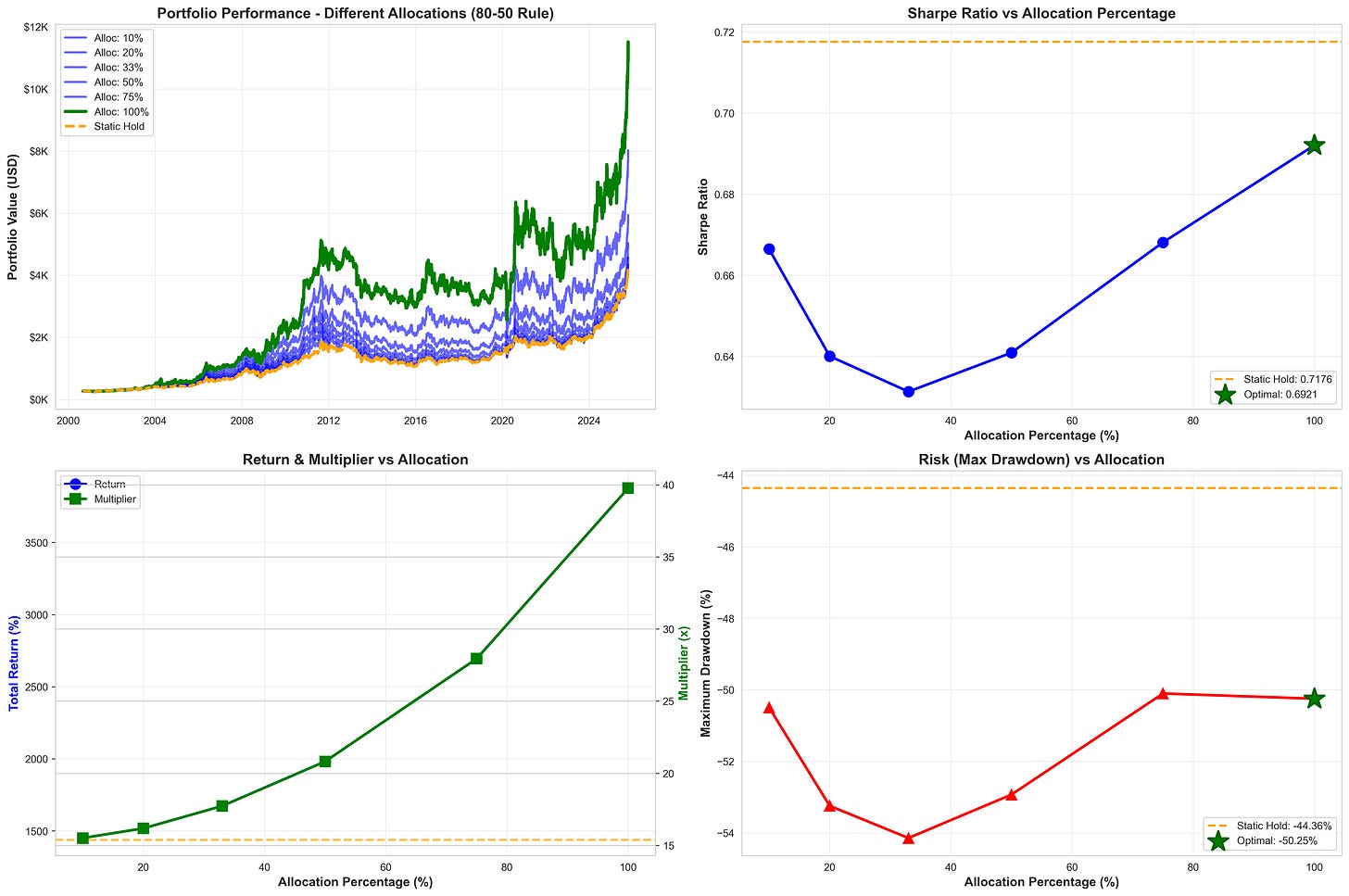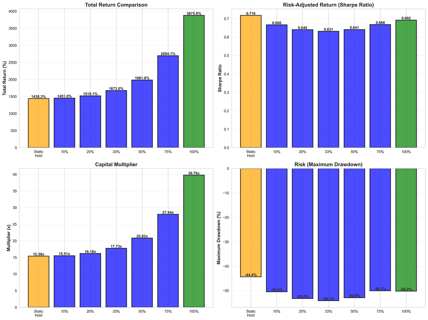 However, here’s the critical nuance: on a risk-adjusted basis (Sharpe ratio), static gold holding actually performed slightly better. The ratio strategy had higher returns but also higher volatility and a deeper maximum drawdown (-50.25% vs -44.36%).