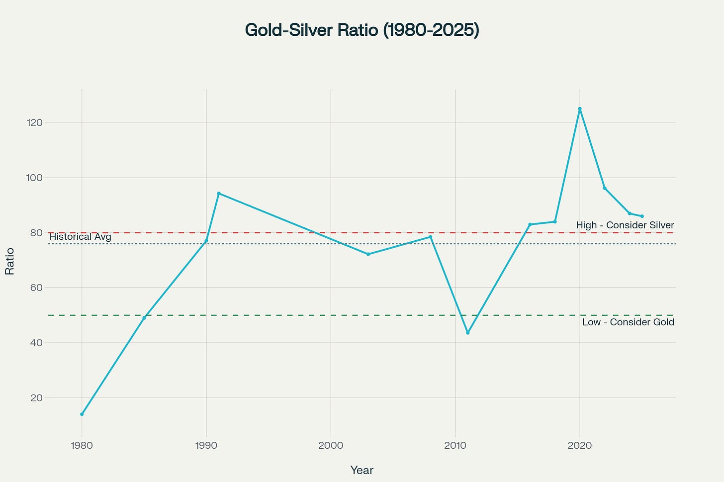 As of October 2025, with gold around $4,250/oz and silver at $53/oz, the ratio sits at about 80:1. This means you need 80 ounces of silver to buy one ounce of gold.