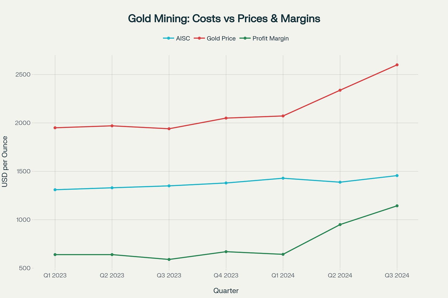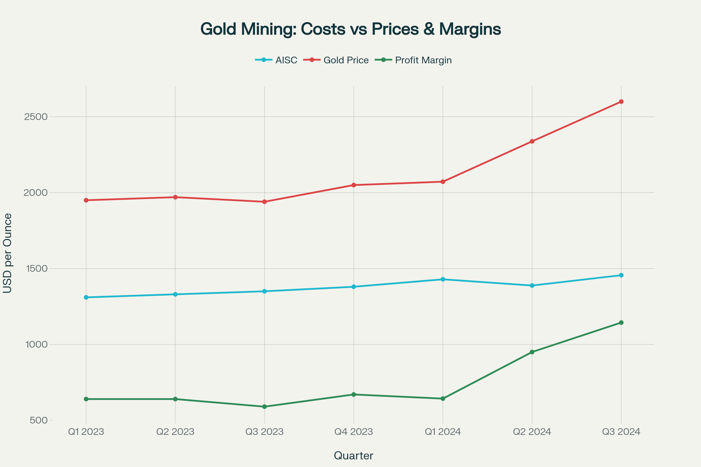Despite persistent challenges, the gold mining sector is experiencing exceptional profitability. All-in sustaining costs (AISC) reached $1,456 per ounce in Q3 2024, the highest point in over a decade, yet average producer margins simultaneously hit $1,144 per ounce—the strongest since 2012. This paradox underscores the industry’s current reality: 97% of primary gold production remained profitable in Q3 2024, demonstrating the remarkable buffer provided by soaring gold prices.