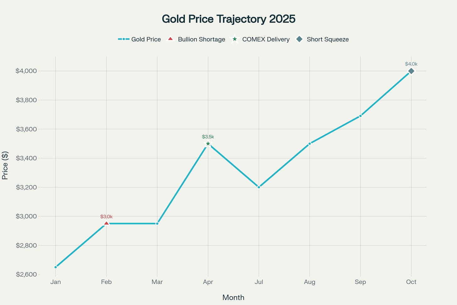 The gold market stands at a critical juncture in October 2025, with prices reaching unprecedented heights above $4,000 per ounce—a staggering 51% increase year-to-date. Behind this meteoric rise lies a potentially explosive situation that could reshape precious metals markets: the mounting evidence of a systematic short squeeze driven by an unsustainable fractional reserve system where up to 250 paper gold certificates may claim ownership of each physical ounce. This investigation reveals how decades of market manipulation, regulatory gaps, and the fundamental disconnect between paper and physical gold markets have created conditions for what could become the most significant precious metals crisis in modern financial history.