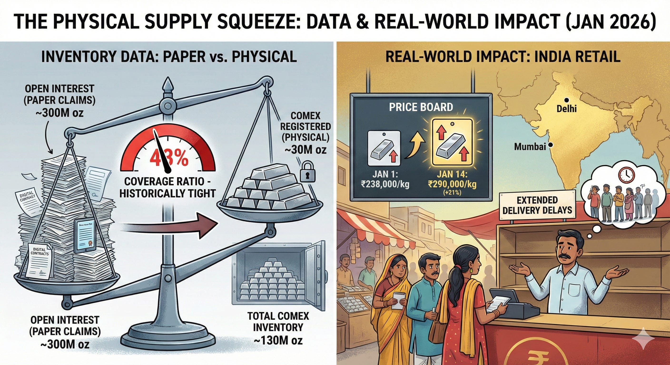 The Real-World Impact: We are seeing the effects of this tightness most clearly in India. Retail prices there jumped from ₹238,000/kg on Jan 1 to ₹290,000/kg on Jan 14—a 21% increase in two weeks. Major dealers in Mumbai and Delhi are reporting extended delivery delays, confirming that physical metal is becoming harder to source in quantity.